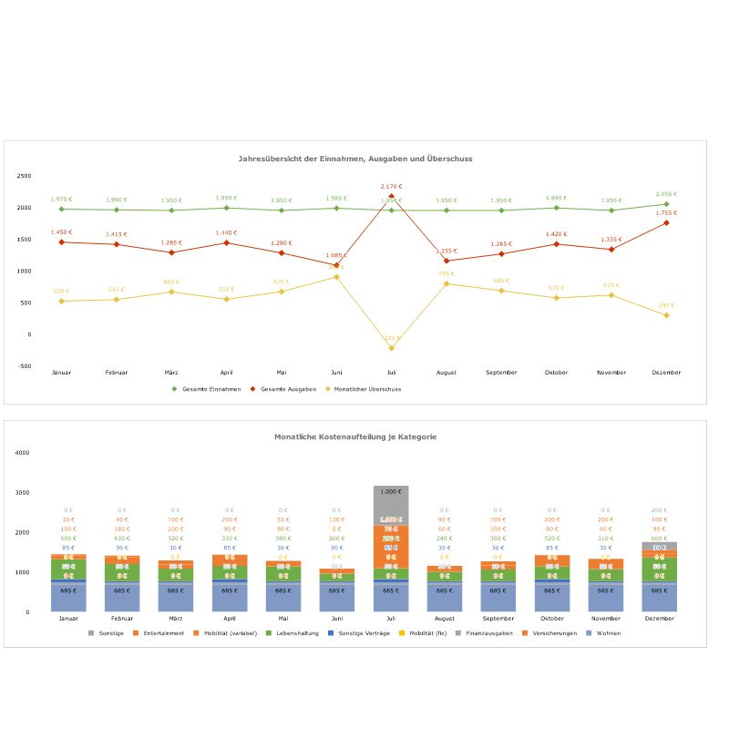 Richte deinen Budget-Planer einmal ein und genieße bis zu 12 Monate durchgehende Finanzplanung ohne zusätzlichen Aufwand. Unsere Tools helfen dir, deine finanziellen Ziele visuell zu veranschaulichen und ohne ständige Neukonfiguration zu erreichen.